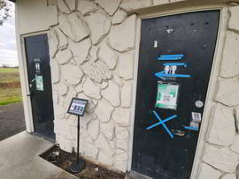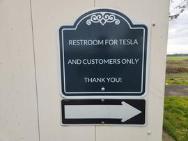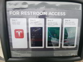This first Tesla Supercharger stop was at a location that appears to once have been a gas station. There were also some signs indicating that food was once sold here but now the building was vacant. Only one of the two restrooms were still operational and were reserved for just Tesla owners. As you can see from the above, you had to have the Tesla App on your mobile phone in order to obtain the lock code to enter the restroom. There was a big puddle over the drain in the middle of the floor. My only guess was the sink was leaking and caused the puddle. It appears that someone had turned the sink valve to an almost closed position to stop the leak. They left it open enough to allow a small trickle of water to still come out of the faucet, enough to wash your hands, but not enough to add to the puddle.