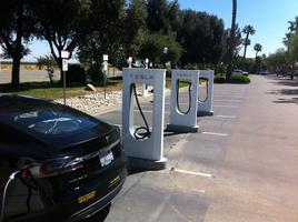 The Tejon Ranch Tesla Supercharging Station is powered by solar panels. The solar panels also provide shade which helps to keep the vehicle cooler while sitting and charging. Most of the Supercharging Stations that I frequent are not powered by solar panels, but I think the plan is to eventually convert more of them to solar panel charging. Also, most of the earliest installed Supercharging Stations are configured such that you drive your car directly into a bay in the charging station and then back out of the bay when you are finished. I've noticed that most of the newer Supercharging Stations that I have been to require you to back up to the Supercharger. Personally I prefer driving forward into a charging bay rather that backing into a charging space.