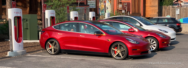 Tahoe City Supercharger. First car was a Model 3 with gold brightwork, second car is our Big Red.