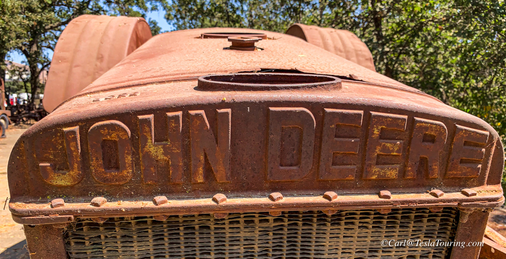 Many pieces of retired farm machinery line the road behind the Hollister Supercharger.